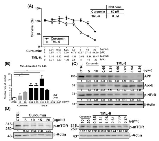 The cytotoxicity studies, inhibitory concentration (IC)50, and biologic studies of TML-6. TML-6 could transcriptionally activate the Nrf2 promoter, suppress the expression of the amyloid precursor protein (APP) and phospho-NF-κB, and in contrast, increases the ApoE and phospho-mTOR expression in Huh-7 cell line. (A) The cytotoxicity (IC50 assay) of traditional curcumin and TML-6 were examined by CCK-8 in Huh-7 cells for 24 h. The working concentration of traditional curcumin and TML-6 was expressed in μM and μg/mL separately for comparison. The IC50 of curcumin and TML-6, 60 and 8 μM, respectively, is expressed at the right side of Figure 2A. In the following studies, the dose concentration was expressed in μg/mL only, as indicated in Figure 2B–D. (B) The luciferase plasmid contains the Nrf2 promoter co-transfected with pRL-TK (Renilla) into Huh-7 cells by Lipofectamine 2000. Transfected cells were treated with curcumin and TML-6 for 24 h, and the Nrf2 promoter activity was analyzed by the Dual-Luciferase Report assay system. TML-6 could exhibit transcriptional activation of the Nrf2 gene in a dose-dependent manner, with the highest activity at a concentration of 1.32 µg/mL, which was 12.1- and 6.6-fold stronger than the traditional curcumin at a dose of 10 and 20 µg/mL, respectively. Data represent the mean with a standard deviation (SD) error bar and p value < 0.05 was considered significant (* p < 0.05, ** p < 0.01). The Nrf2 promoter plasmid revealed a higher cytotoxicity beyond 5.24 μg/mL. (C) Huh-7 cells were treated with different doses of traditional curcumin and TML-6 for 24 h. Western blotting was performed to examine Alzheimer’s-related protein molecules such as APP, Apo E, inflammatory marker-phosphorylated NF-κB (C), and phosphorylated mTOR (D). The quantification of protein expression levels in APP, ApoE, p-NFkB and p-mTOR were normalized by β-Actin and are shown as fold induction in comparison to the untreated control (CTRL) under immunoblotting data in each panel. These AD biomarker proteins revealed a dose-dependent manner in response to TML-6 treatment.