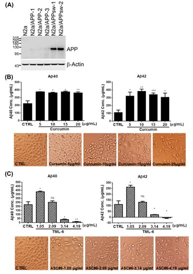 Extracellular levels of soluble Aβ40 and Aβ42 were determined by LEGEND MAX™ β-Amyloid x-40 and X-42 ELISA Kit (Biolegend, San Diego, CA, USA). Overexpression of the APP Swedish mutation (APPswe) in the N2a neuronblastoma cell line was called the N2a/APPswe cell line. N2a/APPswe stable cells were seeded at 8 × 105 cells in 6 cm dishes. After overnight incubation, the cells were treated with curcumin and TML-6 for 24 h. The working concentrations of curcumin and TML-6, as indicated in Figure 2, were prepared by dissolving the TML-6 in DMSO as stock solution and then diluted in 3 mL DMEM medium. The culture supernatant was collected and centrifuged at 1500× g at 4 °C for 5 min to remove cells. The culture supernatants from various treatments were conducted to examine the Aβ levels according to the manufacturer’s instructions. The samples for the detection of soluble Aβ levels were diluted in the supernatant at a 1:10 dilution for this experiment. Levels of soluble Aβ were detected by measuring the OD at 620 nm (Molecular Devices, San Jose, CA, USA). The calculation of Aβ levels was based on the standard curves of Aβ40 and Aβ42, respectively.