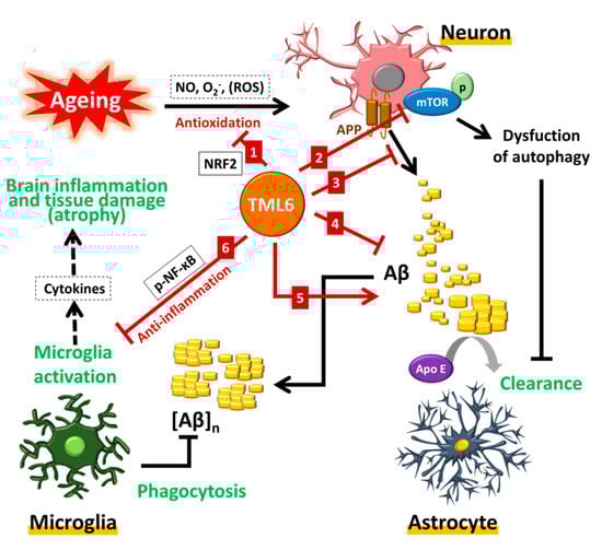 A hypothetical scheme on the potential action mechanism of TML-6 in the therapy of Alzheimer’s disease. Curcumin derivative-TML-6 treatments can induce (1) transcriptional activation of the Nrf2 promoter, which can reduce free radicals, the hallmark of the aging process; (2) following the aging process, the dysfunction of autophagy machinery and activation of mTOR will reduce the autophagolysosomal function to remove the misfolded proteins and lead to the accumulation of Aβ. TML-6 can effectively inhibit the phosphorylation of mTOR and maintain the normal function of autophagy to assure Aβ clearance; (3) TML6 can inhibit the production of Aβ from APP and (4) suppress the synthesis and secretion of Aβ from neurons; (5) TML6 can transcriptionally activate APOE and enhance the clearance of Aβ; (6) TML6 can inhibit the activation of microglial cells and reduce inflammatory injuries in the brain. The future design of therapeutics should combine targeting APP/the Aβ cascade and improving aging-related biological processes.
