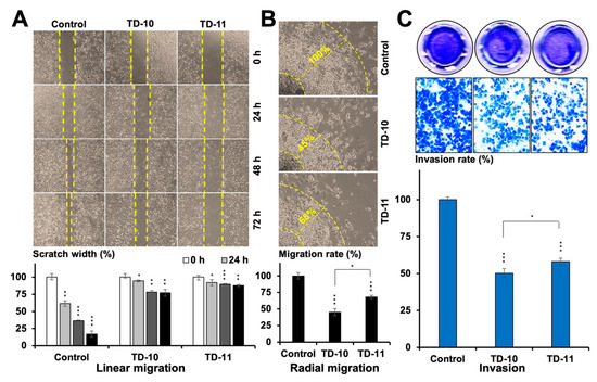 In order to establish the effect of TD-10 and TD-11 on cell migration, we first selected their non-toxic doses by MTT-based dose titration assay in Panc-1, MDA-MB-231, HeLa, DLD-1, T.T and HSC3 cells (Figure S1). A low (nontoxic) dose (IC10 = 0.005% for both TD-10 and TD-11) was used in cell migration (linear and radial migration) and invasion assays. As shown in Figure 1A,B and Figure S2, the non-toxic doses of TD-10 and TD-11 caused a significant delay in the migration of Panc-1, MDA-MB-231 and HeLa cells. Remarkable reduction (~50%) in invasion was recorded (Figure 1C). Of note, the anti-migratory (radial) and anti-invasive effect of TD-10 was comparatively stronger than that of TD-11. Based on these results, we examined the interactions of TD-10 and TD-11 with proteins involved in the regulation of migration and invasion capacity of cells.