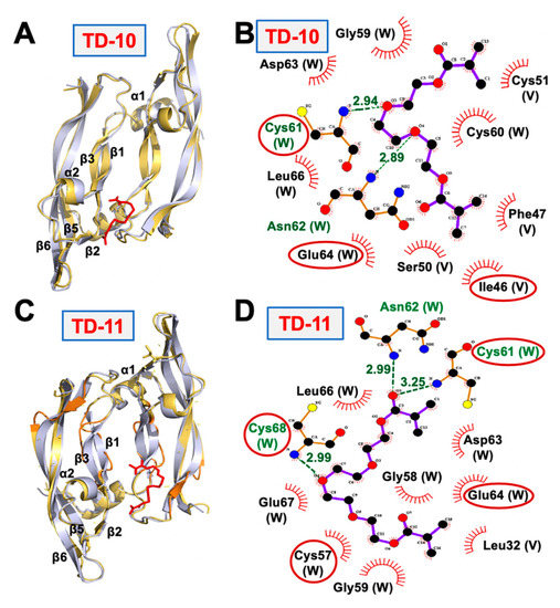 TD-10 and TD-11 were docked to the key interacting residues of both VEGFA homodimer and VEGFA-VEGFR-1 heterodimer complexes [40,41]. Both TD-10 and TD-11 formed hydrogen bonds and hydrophobic interactions with key interacting residues of the VEGFA receptor (highlighted in red circles in Figure 2B,D), suggesting that they could interfere with the interaction of VEGFA and its receptor. TD-11, but not TD-10, also caused local disruption of the secondary structure of VEGFA protein dimer (Figure 2A,C). Docking of TD-10 and TD-11 to VEGFA-VEGFR heterodimer complex revealed that TD-11 was stable at the interaction interface, and no change in the secondary structure of VEGFA was induced in VEGFA-VEGFR complex (Figure 3). The binding energy of VEGFA protein with its receptor, VEGFR, was also slightly reduced from −24.2 kCal/mol to −20.9 kCal/mol and −22.4 kCal/mol in case of TD-11 and TD-10, respectively. These data predicted that TD-11, but not TD-10, is capable of disrupting the secondary structure of VEGFA protein and thereby may interfere with its interaction with VEGFR. On the other hand, TD-11 was not able to either induce a change in VEGFA structure in VEGFA-VEGFR complex or disrupt already assembled complex.