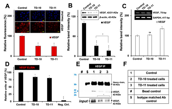VEGF analyses in Panc-1 cells treated with TD-10 and TD-11. Immunostaining (A), Western blotting (B) and RT-PCR (C) showed downregulation of VEGF expression at the protein (A,B) and mRNA (C) levels, respectively. ELISA (D) and immunoprecipitation (E,F) assays showed downregulation of secreted VEGF expression in the surrounding culture medium. Scale 20 µm. Statistical significance was defined as p-values (*) where ns, * < 0.05, ** < 0.01 and *** < 0.001 represent not significant, significant, very significant and highly significant, respectively.
