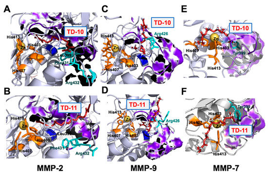 Interaction of TD-10 and TD-11 with S1’ pocket of MMP-2 (A,B), MMP-9 (C,D) and MMP-7 (E,F), respectively. S1’ pocket residues surfaces are highlighted in purple color and gatekeeper residues of S1’ pocket shown in cyan color. Three histidine residues that coordinate catalytic Zn ion are shown in orange color.