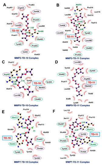 Diagram showing interactions formed by TD-10 and TD-11 with S1’ pocket of MMP-2 (A,B), MMP-9 (C,D) and MMP-7 (E,F), respectively. S1’ pocket residues are highlighted with purple color circle, and conserved residues are highlighted with green circles (residues naming has been done corresponding to MMP-2 protein structure (1CK7)).