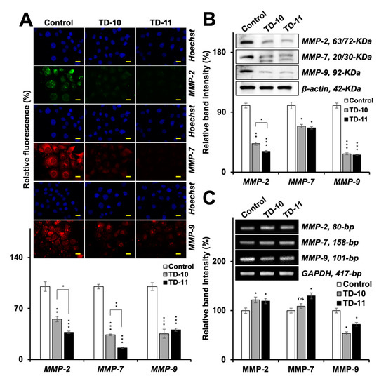 Analyses of MMPs in Panc-1 cells treated with TD-10 and TD-11. Immunostaining (A), Western blotting (B) and RT-PCR (C) showed downregulation of MMP-2 and MMP-7 proteins and inhibition of both protein and transcription of MMP-9. Scale 20 µm. Statistical significance was defined as p-values (*) where ns, * < 0.05, ** < 0.01 and *** < 0.001 represent not significant, significant, very significant and highly significant, respectively.