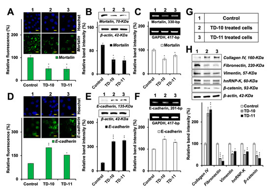 Downregulation of mortalin in response to the treatment with TD-10 and TD-11 in Panc-1 cells. Immunostaining (A) and Western blotting (B) showed decrease in mortalin protein. (C) RT-PCR showed downregulation of expression of mortalin at the transcription level. Immunostaining (D) and Western blotting (E) showed an increase in E-cadherin protein. (F) RT-PCR showed upregulation of E-cadherin at the transcription level. (G) List of treatments in A–F is shown. (H) Western blotting and quantitation showed upregulation of collagen IV and downregulation of other EMT proteins in cells treated with the TEG derivatives. Scale 20 µm. Statistical significance was defined as p-values (*) where * < 0.05, ** < 0.01 and *** < 0.001 represent significant, very significant and highly significant, respectively.