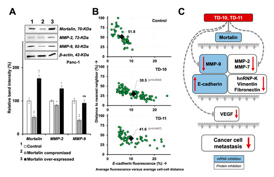 Mortalin has earlier been shown to act as one of the key regulators of EMT [46]. Whereas its over-expression enhances the migration and invasion capability of cells and increases the expression of vimentin, fibronectin, β-catenin, α-SMA, CK-14 and hnRNP-K, its knockdown had been associated with downregulation of these proteins and reversal of EMT [46]. Lung cancer cells treated with TD-10 and TD-11 also showed a decrease in mortalin expression [39]. In light of this information, we examined the expression of mortalin in TD-10 and TD-11 treated Panc-1 cells. As shown in Figure 8A,B, mortalin protein was significantly downregulated in treated cells. Of note, in addition to the downregulation at the protein level as endorsed by immunostaining and Western blotting, we detected a significant decrease in mortalin mRNA in treated cells (Figure 8C). These data supported the decrease in mortalin protein in premises of in silico results that showed poor interactions with TD-10 and TD-11 (binding energy of −0.307 and −2.348 kCal/mol, respectively) with mortalin (Table S1). Furthermore, transcriptional repression of mortalin was consistent and significantly stronger by TD-10 than TD-11 (Figure 8C), and that matched with the effect seen in migration and invasion assays (Figure 1). We also examined the expression of downstream effectors of mortalin involved in EMT. As shown in Figure 8D–G, consistent and proportional upregulation of E-cadherin protein and mRNA was observed in TD-10/-11 treated cells. Proteins that promote mesenchymal transformation (fibronectin, vimentin, hnRNP-K, β-catenin) showed a decrease (Figure 8H) in TD-10- and TD-11-treated cells. On the other hand, collagen IV protein, one of the degradation targets of several MMPs [21], showed an increase. Since these changes seemed consistent with the changes in mortalin in TD-10 and TD-11 treated cells, we next generated mortalin-over-expressing and -compromised cells. Analyses of MMP-2 and MMP-9 proteins revealed that in mortalin-compromised cells, MMP-9 was affected the most and showed a remarkable decrease (Figure 9A). On the other hand, over-expression of mortalin caused an increase only in MMP-2. These data supported the effects of a decrease in mortalin at mRNA and protein levels in TD-10- and TD-11-treated cells. We next examined if such a decrease in mortalin and MMP-9 was sufficient to reverse the EMT signaling and determined intercellular distance that is translated to the cell–cell interactions and cell adhesions (factors active in the epithelial cell phenotype) [47,48]. As shown in Figure 9B, E-cadherin expression was laid inversely to the distance between the cells, indicating that the TEG derivatives induced epithelial phenotype in these cells. The effect was significant for both the derivatives, yet stronger for TD-10 than for TD-11. Thus, taken together, our results suggested that the TEG derivatives TD-10 and TD-11 have multimode actions: in addition to the targeting of VEGF and MMPs, they possess the potential to transcriptionally suppress mortalin and MMP-9, leading to the reversal of EMT and epithelialization of the metastatic cancer cells.