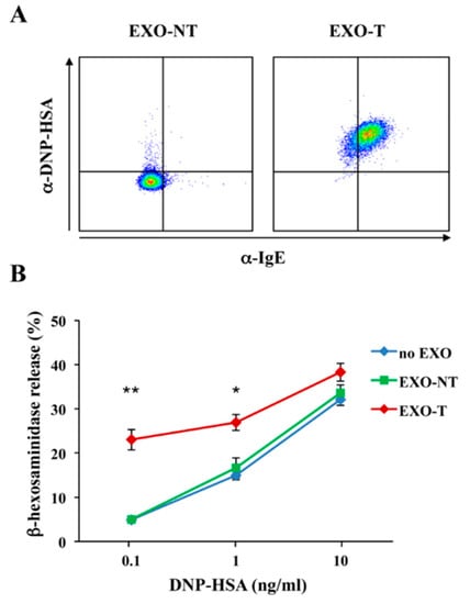 The addition of exosomes derived from stimulated RBL-2H3 cells (EXO-T) significantly increased β-hexosaminidase release induced by suboptimal doses of multivalent soluble antigen, while, exosomes produced by unstimulated MCs (EXO-NT) did not affect antigen-induced MC degranulation (Figure 2, panel B). Similar results were also obtained with primary mBMMCs (data not shown).