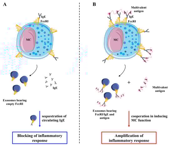 In this scenario, a likely model is the one depicted in Figure 3. MCs release exosomes bearing empty FcεRI complexes either constitutively or upon antigen-independent stimuli. These nanovesicles can bind free IgE and inhibit the inflammatory response (Panel A). On the other hand, upon FcεRI engagement by means of IgE and antigens, MCs release exosomes bearing receptors, IgE, and antigens that can cooperate with soluble antigens to stimulate other MCs, thus amplifying the inflammatory response (Panel B).