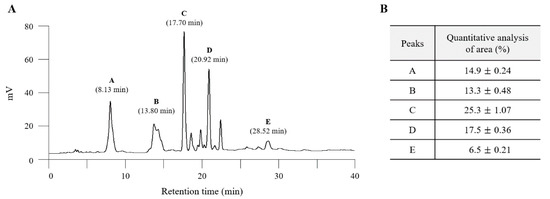 A total of five major peaks were detected at retention times of A (8.13 min), B (13.80 min), C (17.70 min), D (20.92 min), and E (28.52 min) at 280 nm (Figure 1A). The quantitative analysis for each peak was conducted relatively (Figure 1B).