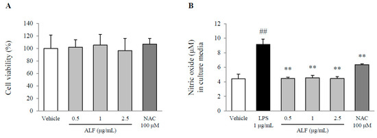 Murine microglial cells (BV2) were cultured in DMEM supplemented with 10% FBS and 1% penicillin–streptomycin. BV2 cells were incubated at 37 °C under 5% CO2, and the cells (2 × 104 cells/well) were seeded into 96-well microplates and then incubated for 12 h. Then, the cells were pretreated with ALF (0.5, 1, and 2.5 μg/mL) or a positive control (NAC, 100 μM) for 24 h. To evaluate the cytotoxicity of ALF, we determined the cell viability with a WST-8 assay (EZ-Cytox, DoGen, Korea). Absorbance at 450 nm was measured using a UV spectrophotometer (Molecular Devices, Sunnyvale, CA, USA).