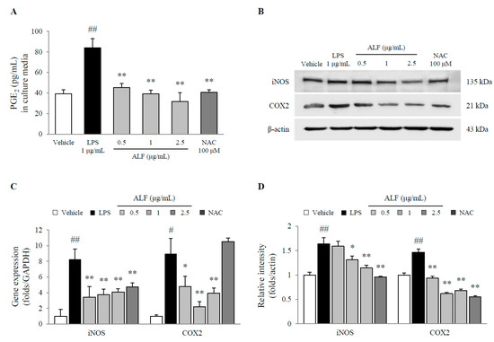 The level of prostaglandin E2 (PGE2) was significantly increased by treatment with LPS (2.1-fold, p < 0.01), whereas pretreatment with ALF dose-dependently inhibited the level of this molecule (p < 0.01 for all doses, Figure 3A) compared with LPS treatment. Moreover, pretreatment with ALF substantially attenuated increased expression of inducible nitric oxide synthase (iNOS) and cyclooxygenase-2 (COX-2) at both the mRNA and protein levels following exposure to LPS (p < 0.05 or p < 0.01, Figure 3B–D). NAC had similar effects as ALF.