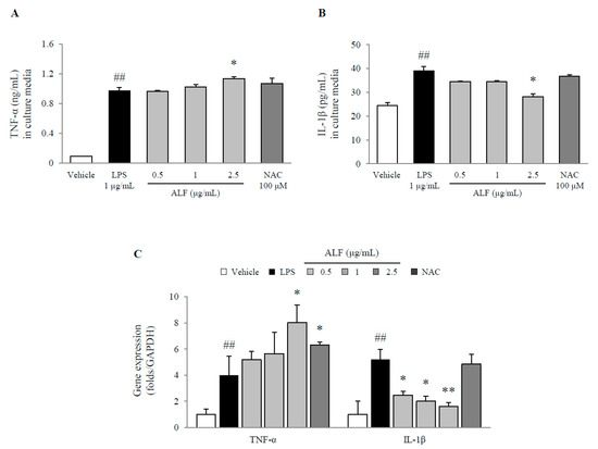 LPS treatment significantly increased the serum levels of TNF-α (10.6-fold, p < 0.01) and IL-1β (1.6-fold, p < 0.01), while 2.5 μg/mL of ALF exhibited a notable inhibitory effect on IL-1β (p < 0.05, Figure 5A,B) compared with LPS treatment. These results corresponded to gene expression, as shown by inhibition of the IL-1β mRNA levels (p < 0.05 or p < 0.01, Figure 5C). In contrast, pretreatment with ALF increased TNF-α at both the protein and gene levels compared to that in the LPS-treated cells (p < 0.05, Figure 5A,C). NAC had no effect on either cytokine.