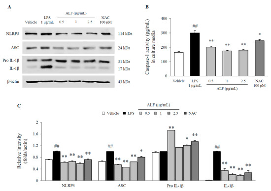 LPS significantly increased the protein levels of NLRP3 inflammasome components, including NLRP3, ASC, and mature-IL-1β (p < 0.01 for all proteins), and caspase-1 activity was significantly increased by 1.8-fold (p < 0.01) compared with that in the vehicle-treated cell. Meanwhile, these elevations were substantially normalized by pretreatment with ALF (p < 0.05 or p < 0.01, Figure 6A–C). NAC similarly inhibited activation of the NLRP3 inflammasome.