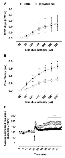 Extracellular field post-synaptic potentials (fEPSPs) recorded in the CA1 stratum radiatum. (A) Relationship between the fEPSP slope and the stimulus intensity. (B) Fiber volley amplitude vs. stimulus intensity. CTRL (n = 8 slices from 6 animals) vs. (d)CASQ-null (n = 6 slices from 5 animals). Two-Way ANOVA test: F(1, 84) = 49.42, p < 0.01; Sidak’s multiple comparisons test: * p < 0.05, ** p < 0.01. (C) fEPSP slope (10% and 80% of max) recorded before and after the Schaffer Collateral high-frequency stimulation: the arrow indicates the stimulus application. Values were normalized to the mean value obtained over the last 20 min of the baseline period and expressed as a percentage of this baseline value (n = 9 slices from 6 animals vs. n = 10 slices from 5 animals in CTRL and (d)CASQ-null, respectively). Two-way ANOVA test: F(1,17) = 13.06, p < 0.01; Sidak’s multiple comparisons test: ** p < 0.01.