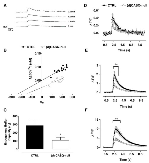 The Ca2+ concentration at rest, [Ca2+]0, showed a trend towards higher values in (d)CASQ-null mice, which however was not found to be significantly different in the two experimental groups (Table 2). We then assessed the unperturbed changes in [Ca2+]i, evoked by a single action potential, that would have been detected in the absence of exogenous Ca2+ buffer (κB; Table 2 and Figure 4B). Additionally, in this case the difference between the two experimental groups was not significant, even though a trend towards higher values could be noticed in (d)CASQ-null mice (Table 2, Figure 4B). Very similar was the Δ[Ca2+]AP (i.e., [Ca2+]i transient evoked by a single action potential) in (d)CASQ-null and CTRL mice (Table 2; Figure 4D) as well. However, the [Ca2+]i transient amplitude decreased in the (d)CASQ-null mice in comparison with the CTRLs when elicited by action potential trains of 20–100 Hz (Figure 4E,F), suggesting less calcium influx and possibly calcium-induced calcium release under high-frequency stimulation in CASQ deletion conditions. Finally, the endogenous buffer capacity (κS) was significantly reduced in conditions of CASQ deletion (Figure 4B: κB: x-intercept—1; Figure 4C), indicating a lower ability of cells to handle Ca2+ load.