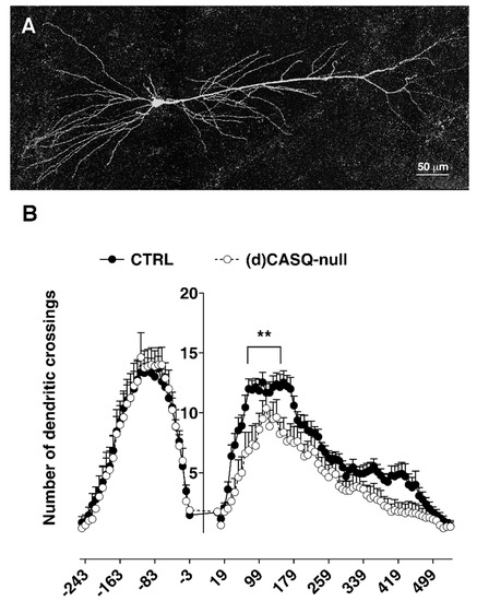 Dendritic tree complexity analysis of CA1 pyramidal neurons. (A) Picture showing an example of CA1 pyramidal neuron filled with biocytin and reconstructed by a confocal microscope used to perform the Sholl analysis. (B) The graph represents the number of dendritic crossings along the concentric Sholl rings at different distances from the soma. n = 13 cells from 6 animals vs. n = 8 cells from 6 animals in CTRL and (d)CASQ-null, respectively. Two-way ANOVA test: apical dendrites F(1, 19) = 7.196, p < 0.05; Sidak’s multiple comparisons test (75 µm ** p < 0.01; 83 µm ** p < 0.01; 91 µm ** p < 0.01; 155 µm * p < 0.05; 163 µm ** p < 0.01; 171 µm * p < 0.05); basal dendrites F(1, 608) = 0.005, n.s.