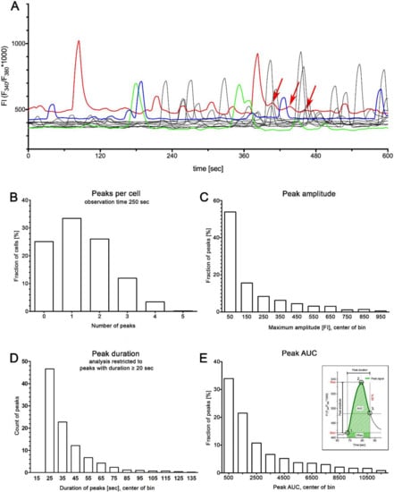 After bulk loading of the cells with 2.5 mM of fura-2-acetoxymethylester (fura-2AM), spontaneous Ca2+ activity was recorded for 250 s (n = 11 experiments). In total, 1173 cells were analyzed. At least one transient elevation of the intracellular calcium concentration (calcium transients) was recorded in 879 (75%) of the cells, while 25% of the cells showed no spontaneous calcium activity (Figure 1A). Detailed analysis of the peak characteristics revealed a mean of 0.4 peaks /min (n = 879 cells, SD 0.21, 95% CI (0.42–0.45)). The mean peak amplitude was ΔFI = 200 (n = 1592 peaks, SD 262, 95% CI (188–214)) and the mean peak duration was 38.5 s (n = 1592 peaks, SD 23.8, 95% CI (37–40)). Notably, the area under the curves (AUCs) and the peak amplitudes varied considerably (Figure 1B–E). We found a strong positive correlation between the peak amplitude and the AUC (Spearman’s rho rs = 0.959, p < 0.001) and a significant but very weak correlation between amplitude and peak duration (rs = 0.045, p = 0.045). AUC weakly correlated with the peak duration (rs = 0.267, p = 0.001). While the peaks varied in amplitude and frequency, their morphology was remarkably consistent; a fast rise of [Ca2+]i followed by a slow signal decay (Figure 2) was observed. We observed no plateau phase, but the decay often undulated (Figure 1A, arrows).