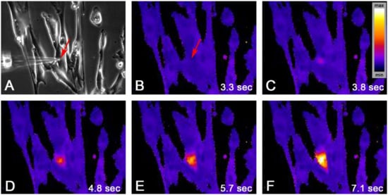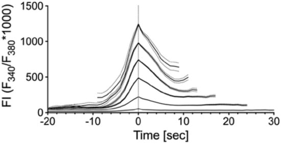 We analyzed 14 independent experiments (two cell cultures). Cells were bulk-loaded with fura-2AM, as described in Section 4.4. Ratio images (340 nm/380 nm) were acquired at a rate of 10 frames per second (fps) in seven experiments and at a rate of 4 fps in seven experiments. The fluorescence intensity (FI) was calculated after background correction as FI = F340 nm/F380 nm ×1000. The mean time of observation after initiation of the calcium signal was 128 s (range: 75 s–199 s). The FI was false color-coded (blue = min FI to white = max FI). An example of a typical experiment is depicted in Figure 3. A calcium transient was initiated in each of the 14 experiments. Compared to the spontaneous calcium transients, the transients had higher mean (±SD) amplitudes (2242 ± 967 FI vs. 599 ± 319 FI, p < 0.0001, unpaired t-test), larger AUCs (476737 ± 430178 vs. 41535 ± 37684, p < 0.0001, Mann–Whitney test) and lasted longer (40.99 ± 20.02 vs. 28.29 ± 14.13 s, p = 0.0363, Mann–Whitney test).
