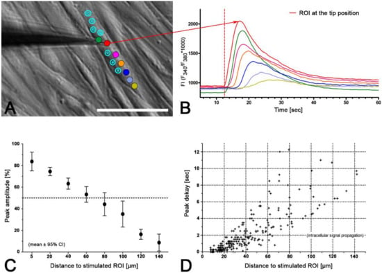 Intracellular propagation of the calcium signal. (A) Position of the glass micropipette (phase contrast): circles indicate the regions of interest (ROIs) of fluorescence measurements, color corresponds to the color-coding of the time resolved fluorescence intensity traces in (B); scale bar = 200 µm; (B) the fluorescence peak intensity decreased with increasing distance from the site of signal initiation; traces smoothed; (C) peak amplitude (%) versus distance to the site of stimulation (binned data, x-axis = center of bin; bin 5 = > 0 to < 10; bin 20 = ≥ 10 to < 30)—note the linear decay; (D) plotting of the peak delay versus the distance to the site of stimulation showed mainly linear correlation with increasing scattering at higher distances.