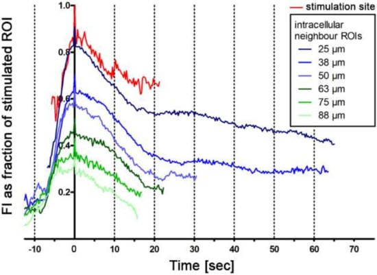 The intercellular propagation velocities of 32.8 µm/s and data from the literature promote the idea that IP3 rather than Ca2+ proper is responsible for the triggering of calcium transients in neighboring cells. IP3 has an up to 22-times higher diffusion rate and a 10-fold higher lifetime and is thus able to trigger Ca2+ release from neighboring cells in a range of 24 µm from the point of initiation [,]. In addition, there is evidence that Ca2+ rapidly closes GJ, possibly via binding to calmodulin (CaM), which in turn closes the GJ channel by binding to Cx43 []; review [].