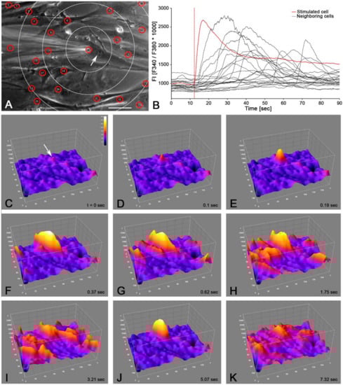 Analysis of the intercellular propagation of the calcium signal. (A) Position of the micropipette (stimulation site); ROIs (red circles); white circles indicate sections: 50 µm, 100 µm, 150 µm); nucleus of stimulated cell (white arrow); phase contrast image; scale bar = 50 µm. (B) Typical recording of calcium transients in the stimulated cell (red trace) and the neighboring cells (black traces); recording speed: 10 fps. (C–K) Surface plot of the propagation of the calcium wave over the functional syncytium: (C) pre stimulation; (D) 0.1 s after stimulation; white arrow indicates stimulation site. Note that first calcium peaks in neighboring cells already occurred within 1 s after stimulation (E–G); maximum excitation is seen about 3-5 s after stimulation (I,J); excitation decay is seen after 7 s (K); instant of time since stimulation is indicated bottom right; color-coding ranged from FI = 0–3200 (inset in C).