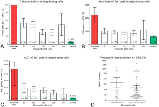 Analysis of the calcium peaks and transients in neighboring cells compared to the first peaks in the stimulated cells; (A–C) the neighboring cells were grouped into distance groups (upper bin limit indicated); (D) the propagation speed of the calcium signal was compared between near (≤50 µm) and far (>50–250 µm) neighboring cells. Note the split of the y-axis and the bimodal distribution of speeds; controls = cells with spontaneous activity; green dotted line indicates upper 95% CI of the controls.