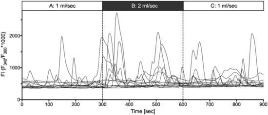 Cells were adapted to the experimental conditions by 15 min superfusion with 1 mL/min. We then recorded the calcium activity for 5 min in each section: (A) 1 mL/min, (B) 2 mL/min, (C) 1 mL/min.