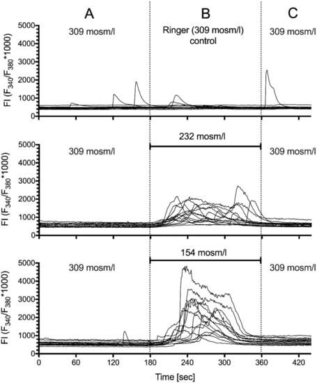 After adaptation for 15 min to the experimental conditions (309 mOsm/L, 1 mL/min flow), cells were challenged either with 232 mOsm/L or 154 mOsm/L for 3 min. Recordings of the calcium activity were done for three minutes in each section (A,B,C). For control, the flow was switched to 309 mOsm/L in section B.