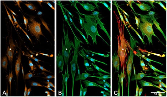 Immunocytochemical characterization of the suIC in cell culture. Triple staining of (A) calreticulin (CALR, orange), (B) vimentin (VIM, green) and (C) α-smooth muscle cell actin (aSMA, red); all cells show immunoreactivity (IR) for CALR and VIM, while only very few cells show strong aSMA staining of stress fibers (asterisks); nuclei are stained with 4′,6-diamidin-2-phenylindol (DAPI, blue).