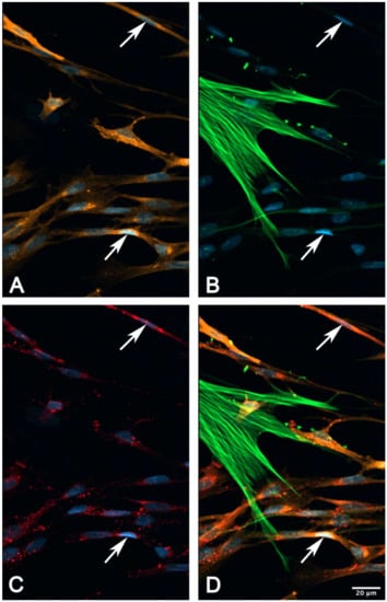 We used cell cultures of passage 4-6 to examine the expression of characteristic marker proteins. We performed multiplex immunocytochemical detection of CALR/VIM/aSMA, PDGFRa/aSMA/CALR and PDGFRa/aSMA/Cx43 to define the suIC subtypes. All cells showed VIM-IR, classifying them as mesenchymal ICs (Figure 10B). Most cells were PDGFRa+/aSMA−/CALR+ with medium-sized ovoid nuclei and fusiform cell shapes (Figure 10 and Figure 11, Figure S2). A subpopulation was characterized by small elongated nuclei and at least one long process, which often extended to over 200 µm (Figure 10; Figure 11, arrow-heads). Only a small cell population (about 6%) showed classical myofibroblast differentiation, with strong aSMA staining of actin stress fibers, lacking PDGFRa expression (Figure 10, asterisks). In conclusion, most of the cultured suICs resembled the typical (type 1, PDGFRa+/CALR+/aSMA−) telocyte and a smaller fraction showed the characteristic staining pattern of hybrid (type 2, PDGFRa+/CALR+/aSMA+) telocyte, as defined by Vannucchi and coworkers [].