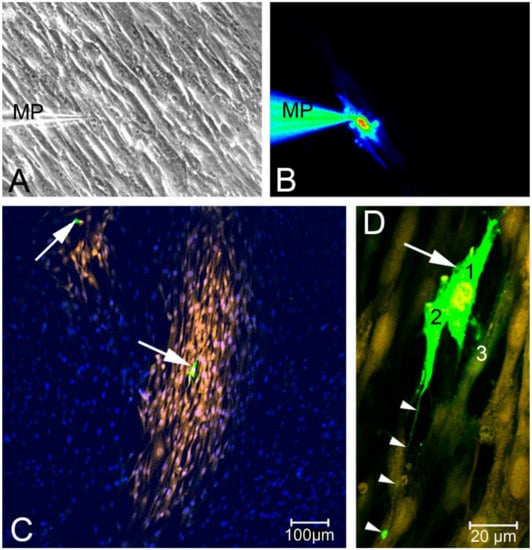 Lucifer Yellow (LY) injection revealed functional syncytia in cultured suICs. (A) Phase contrast, MP (micro pipette); (B) injected cell filled with LY after 90 s; (C) cell culture with two injected cells (arrows) showing distribution of the LY, defining variably sized functional syncytia; (D) the LY injected cell (arrow) and a direct neighboring cell show bright LY-fluorescence signal; arrow-heads indicate a fine process contacting another cell, spanning a distance of approximately 100 µm; nuclei (DAPI, blue); modified reproduction with permission from Neuhaus et al. 2007 [].