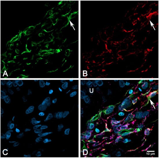 The 3D projection of a confocal image stack (voxel size (yxz): 0.06 µm × 0.06 µm × 0.39 µm); (A) VIM (green, ex 488 nm); (B) aSMA (red, ex 640 nm); (C) nuclei stained with DAPI (blue, ex 405nm); (D) merged image including Cx43 staining (magenta, excitation at 561 nm). Note that only a few cells are negative for aSMA (arrow); U = urothelium.
