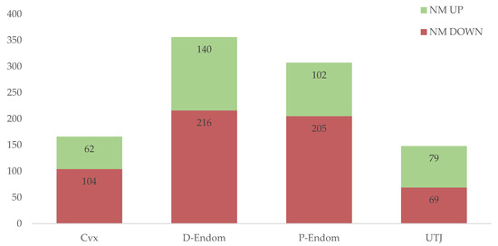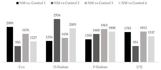 Differential expression of annotated genes in the mucosa of the uterus (endocervix (Cvx), endometrium (distal: D-Endom or proximal: P-Endom) and the utero-tubal junction (UTJ)) of sows induced by natural mating (NM) when compared to cervical AI of different contents; control 1: semen, control 2: seminal plasma from the sperm-peak fraction, control 3: seminal plasma from the entire ejaculate, control 4: sham–AI with BTS extender; negative control. The numbers represent the number of differentially expressed genes (p-value < 0.05).