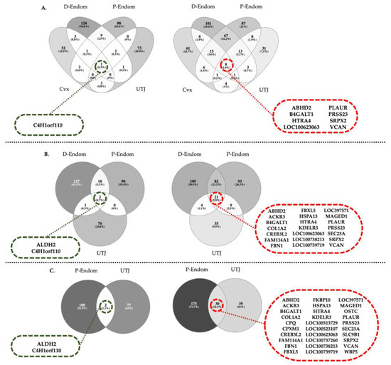 (A–C) Venn diagrams depicting in discontinuous rings the numbers and acronyms of copulation-induced, co-expressed DEGs shared by the different mucosal segments of the sow uterus (endocervix (Cvx), endometrium (distal: D-Endom or proximal: P-Endom) and the utero-tubal junction (UTJ), as listed in Supplementary Tables S1–S4. The diagrams include (A) comparisons of all four segments, (B) when endocervix was excluded or (C) when excluding endocervix and distal endometrium. Upregulated genes in green and downregulated in red.