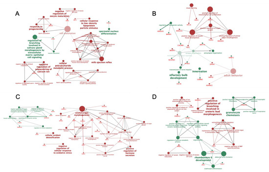 Schematic representation of biologic terms and pathways of selected DEGs, among different mucosal segments of the sow endocervix (Cvx; (A)), endometrium (distal: D-Endom (B) or proximal: P-Endom (C)) and the utero-tubal junction (UTJ; (D) 24 h past copulation. The analysis of overrepresented functional categories was performed using the Cytoscape v3.0.0 application ClueGo v2.0.3. Terms are functionally grouped based on shared genes (kappa score) and are shown in different colors (green: up-regulated; red: down-regulated). The size of the nodes indicates the degree of significance, where the biggest nodes correspond to highest significance and the intensity of the nodes indicates the amount of genes involved in that specific term, where the more intense correspond to the highest number of genes found. The following ClueGo parameters were used: GO tree levels, 1–3 (first level = 0); minimum number of genes, 1; p-value correction, Benjamini–Hochberg, terms with p < 0.05, GO term connection restriction (kappa score), 0.4; GO term grouping, initial group size of 1. The resulting network was modified; that is, some redundant and non-informative terms were deleted and the network manually rearranged.