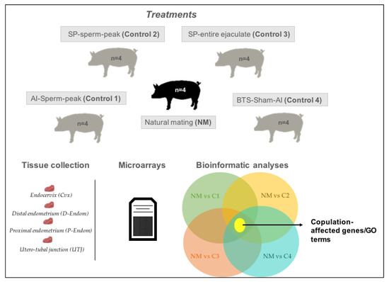 This study aimed to determine if the act of copulation in sows affected the differential expression of genes in the pre/peri-ovulatory genital tract (endocervix, the endometrium and the UTJ), without considering effects of semen or sperm-free SP. The study focused on DEGs not affected by AI with semen (control 1), sperm-free SP harvested from the sperm-peak fraction (control 2), sperm-free SP harvested from the whole ejaculate (control 3) or saline-extender BTS (control 4), 24 h past the procedures, using a microarray chip (GeneChip® porcine gene 1.0 st array, Thermo Fisher Scientific) containing 25,000 gene level probe sets, followed by bioinformatics for enriched analysis of functional categories (GO terms) and restrictive bioinformatic analysis