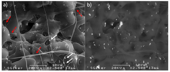 Figure 1 represents the break surface of the PLA/PD-BaSO4 2 wt.% composite. The SEM image corroborates the ductile and tough behavior of the PLA containing 2 wt.% barium sulfate PD-coated particles with values provided in Table 1. A high level of dispersion of PD coated particles (indicated with white and straight arrows) within the PLA matrix can be observed. In the pictures, ductile-deformed threads of PLA matrix appear too, thinner than a micrometer in diameter. This means that the matrix has been stretched during the tensile test beyond the yield point leaving long fibers (red dot-line arrows). Therefore, radiopaque PD-BaSO4 particles were able to act as fixed points that under the external applied stress assisting the PLA matrix to develop specific ductile deformation mechanisms.