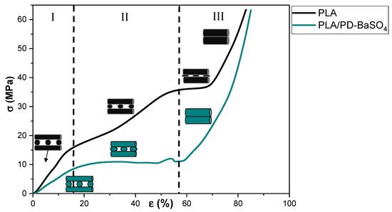 Figure 2 shows the stress–strain curve’s behavior under compression of neat PLA scaffolds and those of its 10 wt.% PLA/PD-BaSO4 composite counterpart. As can be observed the 3D printed PLA and PLA/PD-BaSO4 scaffolds do show different regimes and each regime corresponds to a specific mechanism of a porous structured material, in agreement with bibliography. In the first stage (region I), the walls contribute to the resistance of the scaffolds under compressive load, which results in an elastic response region at initial loads and corresponding strains. In the second stage (II), the pores collapse by buckling of the walls (barreling effect). The third stage (III) is featured by a large increase in stress over strain which may be explained by the fact that scaffolds are now compressed to a size that the scaffold becomes denser and furthermore more strain resistant to the applied load [31,32,33]. Despite the fact that both scaffolds have the same porosity (55%), in Figure 2 the neat PLA behaved like a more rigid structure [34], while PLA/PD-BaSO4 shows again a flexible and softer behavior. Therefore, it can be concluded that the particles confer flexibility to the scaffolds in compression tests.