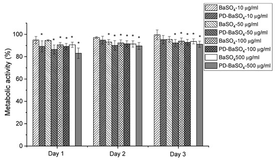 Metabolic activity of Human dermal fibroblasts (HDFs) seeded in the presence of 10, 50, 100 or 500 µg/mL of barium sulfate particles (BaSO4) or barium sulfate particles coated with polydopamine (PD-BaSO4). Asterisks indicate significant differences (p < 0.05) with respect to the control.
