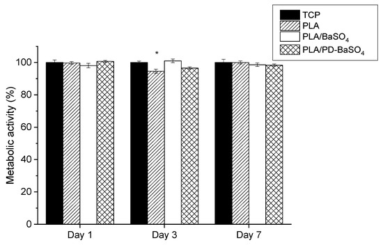 Metabolic activity of Human dermal fibroblasts HDFs seeded on polylactide (PLA), composite of polylactide and barium sulfate particles (PLA/BaSO4) and composite of polylactide and coated with polydopamine barium sulfate particles (PLA/PD-BaSO4) with respect to the control at day 1, 3 and 7. Asterisks indicate significant differences (p < 0.05) with respect to the cells seeded on tissue culture plastic (TCP).
