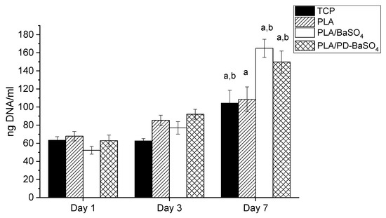 The proliferation of HDFs on PLA, PLA/BaSO4 and PLA/PD-BaSO4 composites was evaluated via DNA quantification. As can be seen in Figure 5, DNA content increased over culture time in all experimental and control conditions. Accordingly, significant differences were observed between DNA content observed at day 7 and that observed at day 1 for all the samples studied. For example, the calculated proliferation rates between day 1 and day 7 were 1.6, 3.2 and 2.4 for PLA, PLA/BaSO4 and PLA/PD-BaSO4, respectively. The metabolic activity and proliferation results demonstrate that the materials employed in this work are not cytotoxic and can provide a cytocompatibility substrate for cells to attach and proliferate. A higher proliferation of HDFs was observed in PLA/BaSO4 or PLA/PD-BaSO4 composites with respect to pristine PLA samples. Is hypothesized that this higher proliferation rate may be associated to surface characteristic of the samples, such as roughness or hydrophilicity [35,36]
