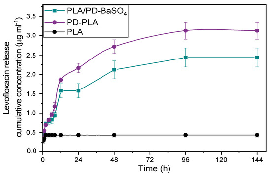 Release profiles over time of levofloxacin in neat PLA, polydopamine coated neat PLA (PD-PLA) and PLA/PD-BaSO4.