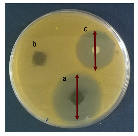 Agar disk diffusion tests: (a) PLA/PD-BaSO4 with levofloxacin, (b) PLA/PD-BaSO4 negative control (no levofloxacin) and (c) levofloxacin disk (5 µg) as a positive control.