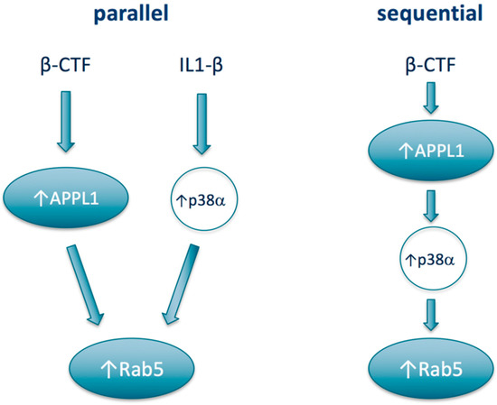 From a therapeutics development perspective, the most relevant preclinical mechanistic study to assess the potential of p38α inhibition as a treatment approach for Rab5-mediated neurodegenerative disease would be to evaluate the effects of a p38α inhibitor in the Rab5-overexpressing mouse. Such studies have recently been initiated and the results are anticipated to be published within the next 12 months [138]. From a mechanistic standpoint, a number of open lines of inquiry around the connection between p38α and Rab5 could be explored. For one, in the AD context, whether APPL1 and p38α may act sequentially or in parallel to increase Rab5 activation has not been defined (Figure 2). On one hand, APPL1 as a scaffolding protein could stabilize active Rab5 on the endosome, while p38α activation leading to increased levels of Rab5-GDI complex would deliver Rab5 to the endosome to associate with APPL1. In this “parallel” construct, APPL1 and p38α could have different upstream drivers; for example, p38α being activated upstream by a well-known activator IL-1β, rather than by β-CTF. However, APPL1 has also been shown to act as a scaffold to the p38MAPK signaling pathway [139] and so may act also upstream of p38α, i.e., sequentially, rather than in parallel to activate Rab5. From a therapeutics development model, the two models could impact the context, e.g., the disease in which p38α inhibitors would be most active.