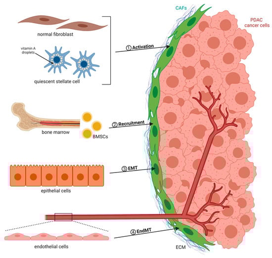Heterogenous sources and activation mechanisms of cancer-associated fibroblasts (CAFs). CAFs can originate from pre-existing fibroblasts and quiescent stellate cells (via activation), bone marrow-derived mesenchymal stem cells (BMSCs) (via recruitment), epithelial cells (through epithelial-to-mesenchymal transition (EMT)), as well as from endothelial cells (through endothelial-to-mesenchymal transition (EndMT)). Abbreviations: pancreatic ductal adenocarcinoma (PDAC); extracellular matrix (ECM).