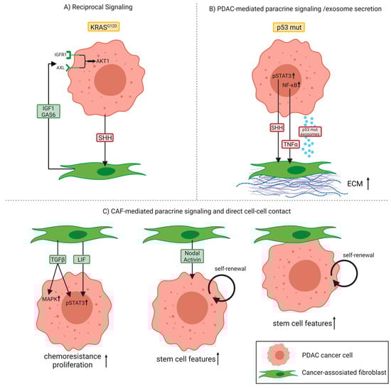 Different mechanisms of crosstalk between pancreatic ductal adenocarcinoma (PDAC) cancer cells and cancer-associated fibroblasts (CAFs). (A) Communication between PDAC cancer cells harboring mutant KRASG12D and CAFs can occur via a reciprocal signaling network. (B) PDAC cancer cells with mutant p53 (p53 mut), which exhibit persistent activation of signal transducer and activator of transcription 3 (STAT3) and enhanced activity of the nuclear factor-κB (NF-κB) signaling pathway, influence CAFs in a paracrine manner or through exosome secretion, stimulating the deposition of extracellular matrix (ECM). (C) CAFs can also secrete paracrine factors acting on cancer cells that lead to an upregulation of mitogen-activated protein kinase (MAPK) and STAT3 signaling and finally to PDAC progression and chemoresistance. Both CAF-secreted factors and direct PDAC–CAF interactions can further induce PDAC stem cell features, thereby promoting self-renewal capacity and invasiveness. Abbreviations: sonic hedgehog (SHH); insulin-like growth factor 1 (IGF1); insulin-like growth factor 1 receptor (IGFR1); growth arrest-specific gene 6 (GAS6); tumor necrosis factor-alpha (TNF-α); transforming growth factor-beta (TGF-β); leukemia inhibitory factor (LIF).