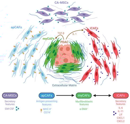 Schematic representation of the so far identified distinct cancer-associated fibroblast (CAF) subtypes in pancreatic ductal adenocarcinoma (PDAC). Three different CAF subsets have been described: (i) myofibroblastic CAFs (myCAFs), which proximally surround neoplastic cells and are defined by high alpha-smooth muscle actin (α-SMA) expression; (ii) inflammatory CAFs (iCAFs), which reside more distantly and are characterized by a secretory phenotype; and (iii) antigen-presenting CAFs (apCAFs) with immunomodulatory features. Literature suggests that CAFs are dynamic and can acquire different phenotypes. Transforming growth factor-beta (TGF-β) and interleukin-1 (IL-1) are tumor-secreted ligands that promote CAF heterogeneity with respect to the myCAF and iCAF phenotype, while the intratumoral trigger for apCAF formation remains unknown. Cancer-associated MSCs (CA-MSCs) represent another unique subtype with characteristics of mesenchymal stem cells (MSCs) and have a secretory phenotype influencing PDAC cancer cells. Most likely additional subtypes will be discovered in the future. Abbreviations: granulocytic-macrophage colony-stimulating factor (GM-CSF); major histocompatibility complex class II (MHC II); leukemia inhibitory factor (LIF); C-X-C motif chemokine ligand (CXCL).