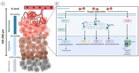 Hypoxia-inducible factors (HIFs), a highly conserved class of transcription factors, are the master molecular regulators in the adaptive responses to alterations in tissue oxygenation [20]. Furthermore, emerging evidence has highlighted the important role played by the kinase mammalian target of rapamycin (mTOR), the unfolded protein response (UPR) in the tumor biology controlled by oxygen deprivation (Figure 1B) and nuclear factor-κB (NF-κB).