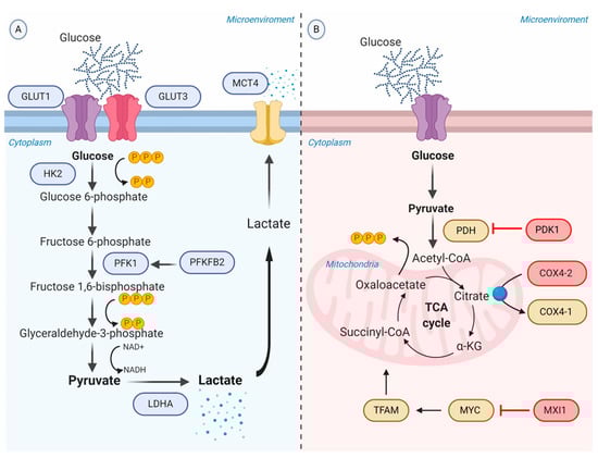 Schematic representation of the glycolytic switch mediated by tumor hypoxia. (A) Regulation of genes encoding glycolytic enzymes involved in the promotion of anaerobic glycolysis. GLUT1 and GLUT3 overexpression increase the rate of glucose import. HK2 phosphorylates the intracellular glucose to glucose 6-phosphate. PFK1, produced by PFKFB2 or induced by HIF-1α, converts Fructose 6-phosphate into Fructose 1,6-bisphosphate and ADP. LDHA catalyzes pyruvate into lactate with concomitant generation of NAD+ from NADH. MCT4 transports lactate to the extracellular environment. (B) Repression of OXPHOS. PDK1 inactivates PDH and blocks the conversion of pyruvate to acetyl-CoA. MXI1 inhibits the transcriptional activity of MYC and thereby inactivates MYC target genes (e.g., TFAM) involved in OXPHOS and mitochondrial dynamics, replication, and biogenesis. The generation and accumulation of ROS are controlled by the activation of the mitochondrial proteases COX4-2, responsible for the degradation of the COX4-1 isoform. Abbreviations: ADP, adenosine diphosphate; COX, cytochrome c oxidase; GLUTs, facilitative glucose transporters; HK2, hexokinase 2; LDHA, lactic dehydrogenase A; MCT, monocarboxylate transporter; MXI, MAX interactor; NAD+, nicotinamide adenine dinucleotide; OXPHOS, oxidative phosphorylation; PDH, pyruvate dehydrogenase; PDK1, Pyruvate dehydrogenase kinase; PFK1, phosphofructokinase-1; PFKFB2, 6-phosphofructo-2-kinase/fructose-2,6-biphosphatase 2; ROS, reactive oxygen species; TFAM, transcription factor A, mitochondrial.